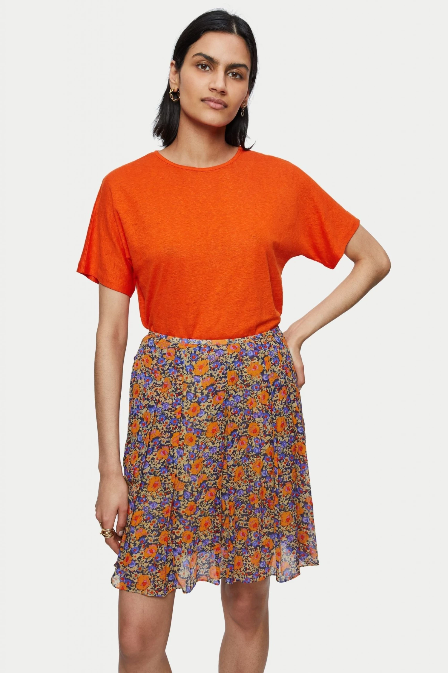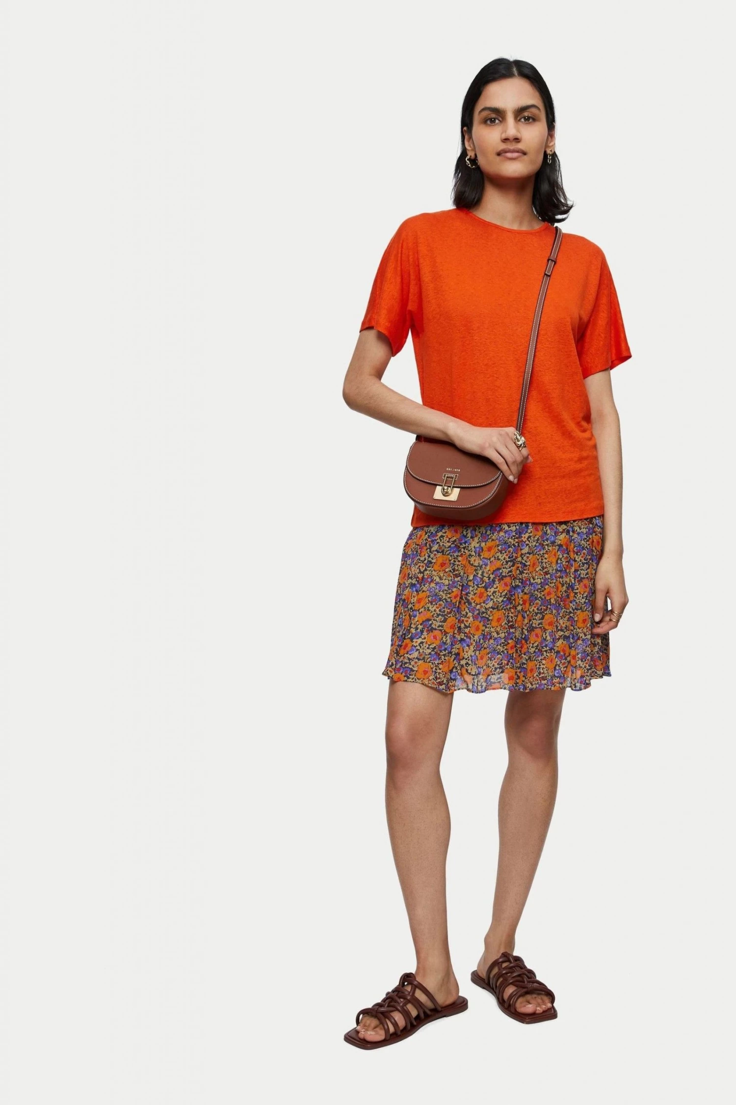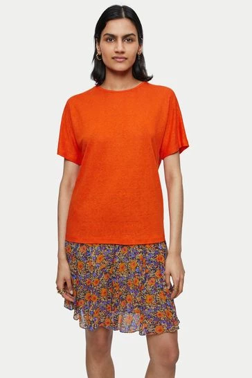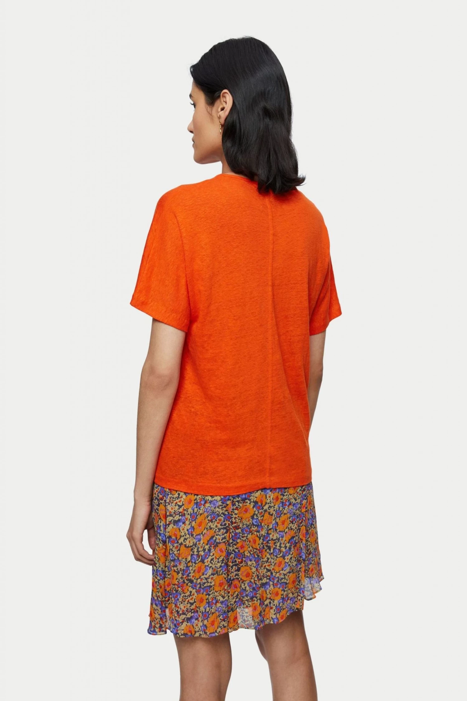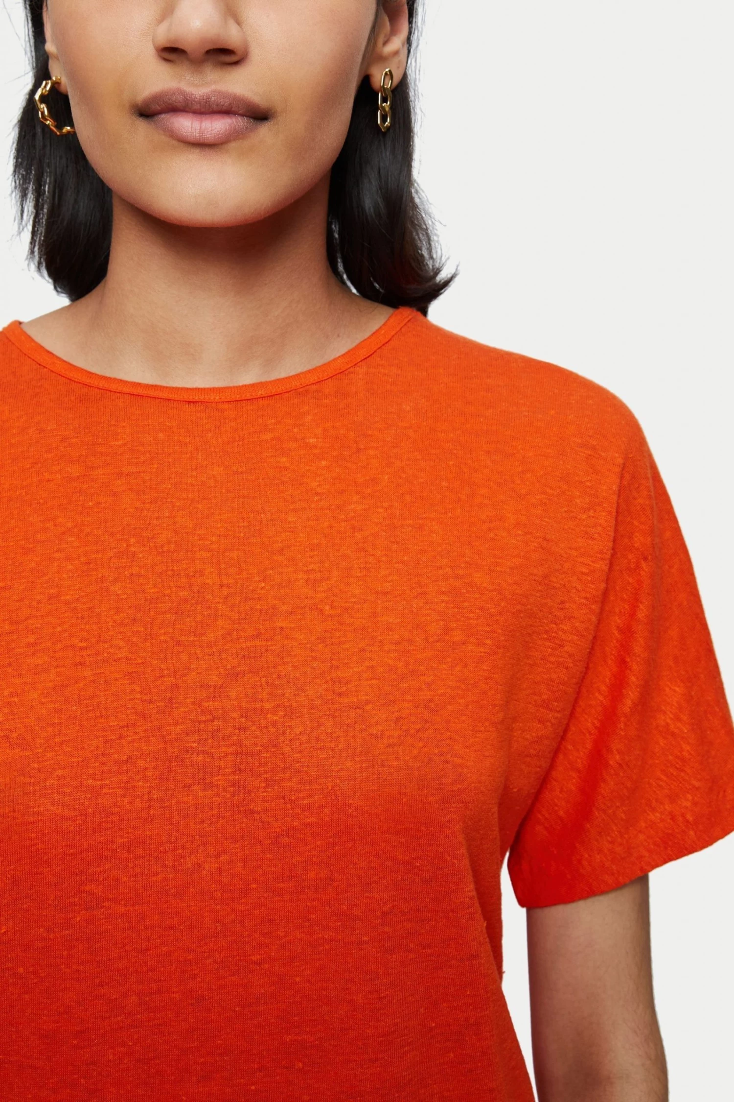 100% Portuguese linen short sleeve T-shirt. Designed with sleeve and body all cut from one piece for an easy and relaxed fit. The neckline is finished with a minimal slim self binding. Linen is a naturally sustainable fabric which feels cool and comfortable against the skin. An effortless piece to style with denim or flowy maxi skirts.