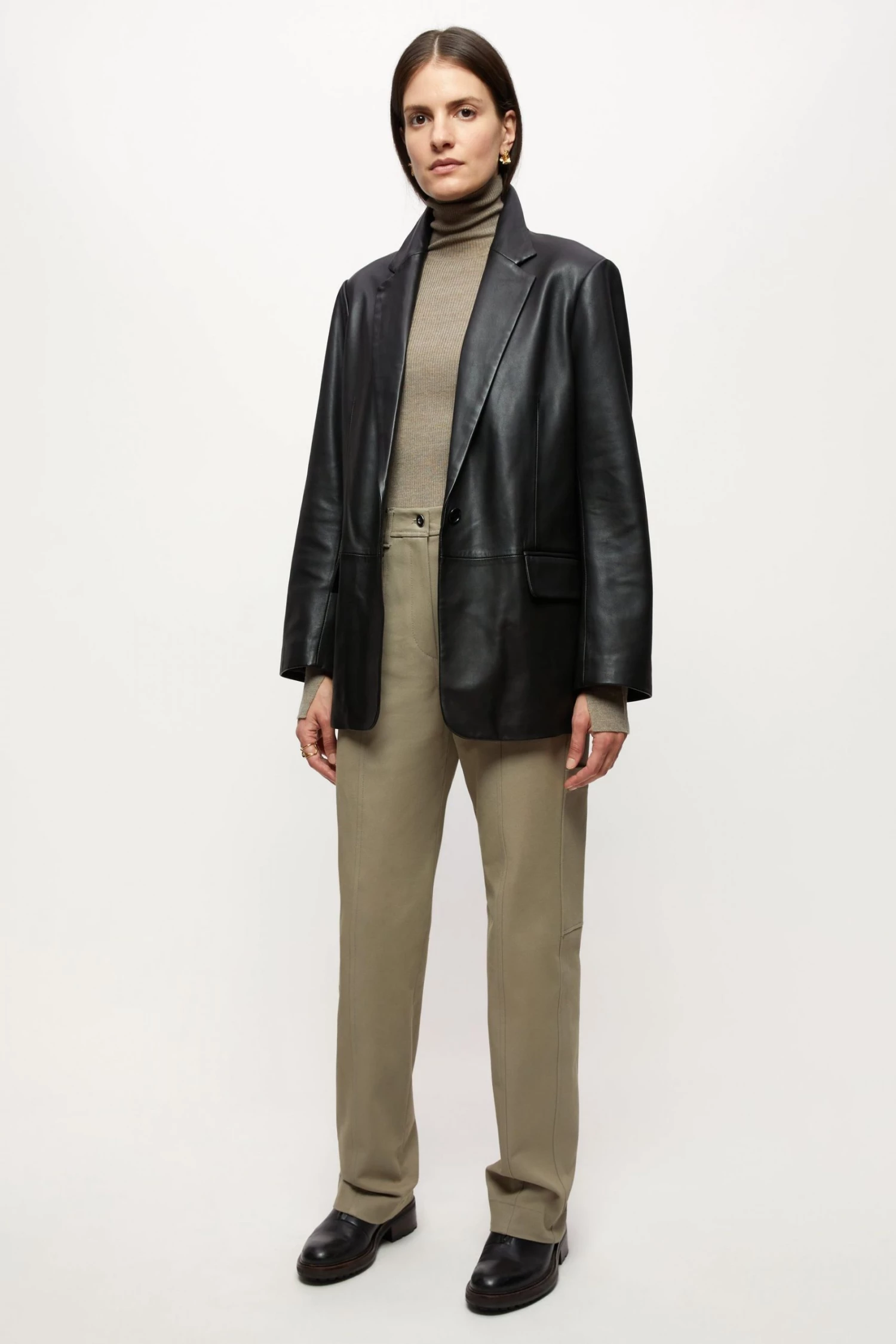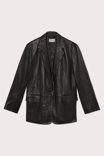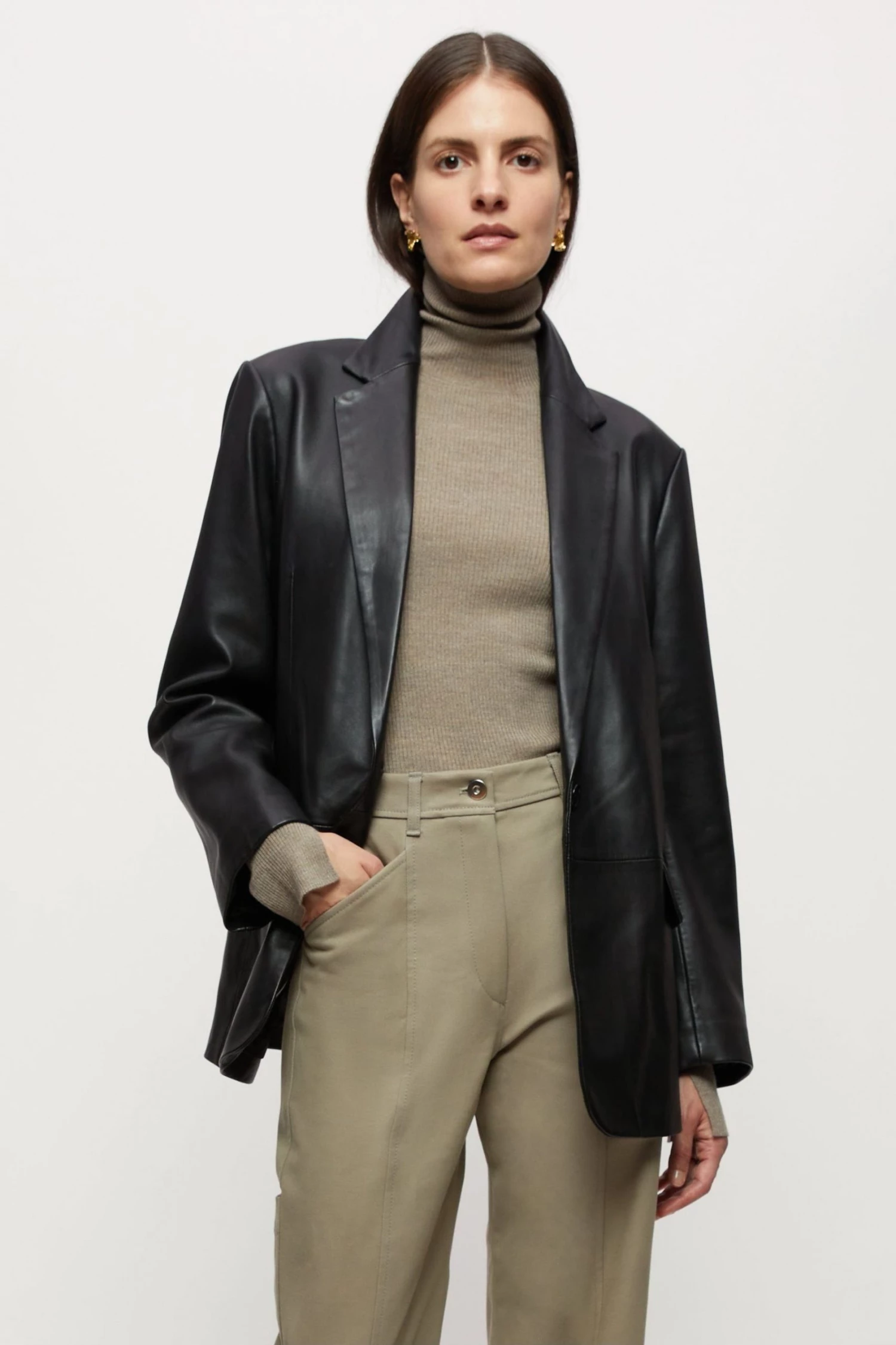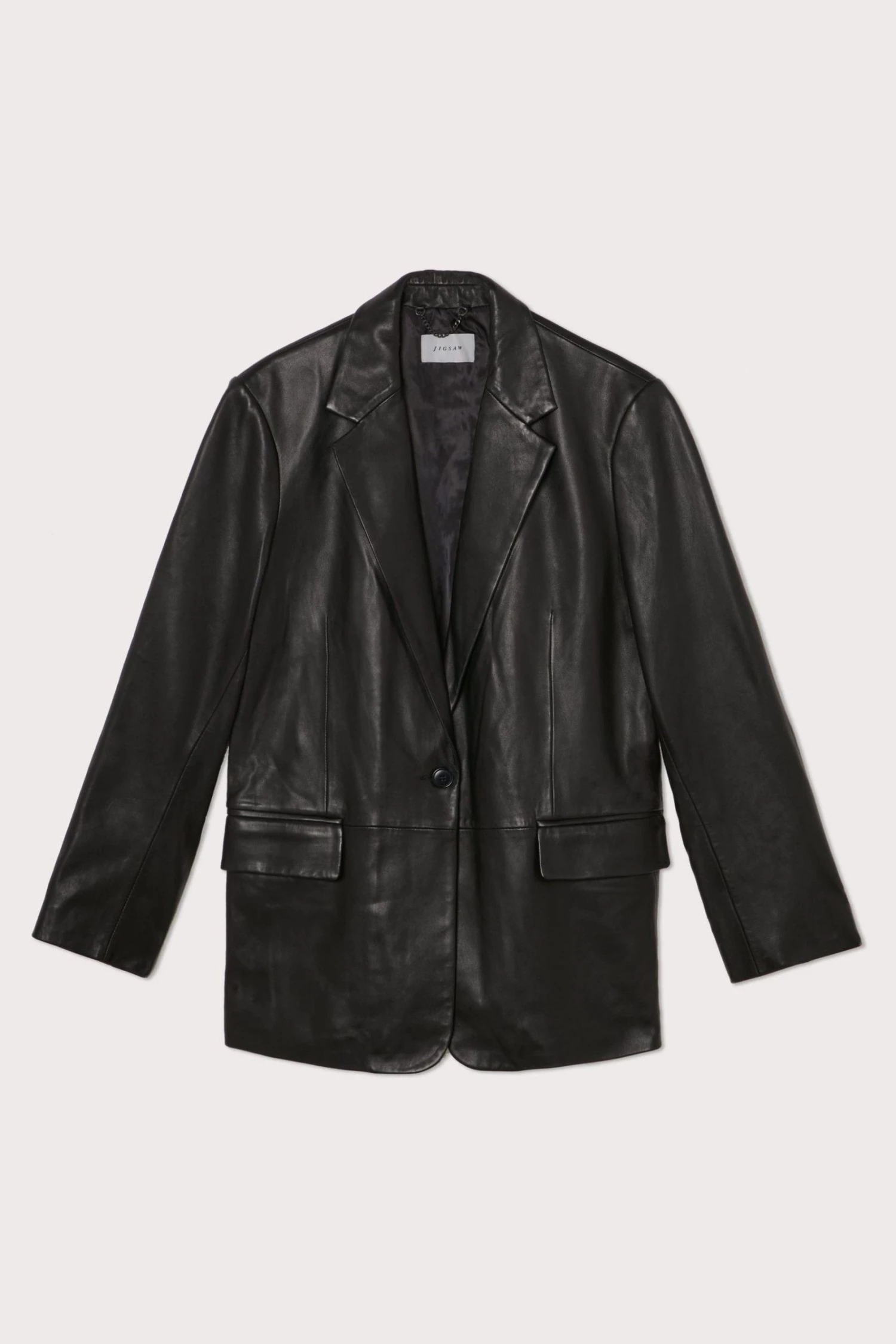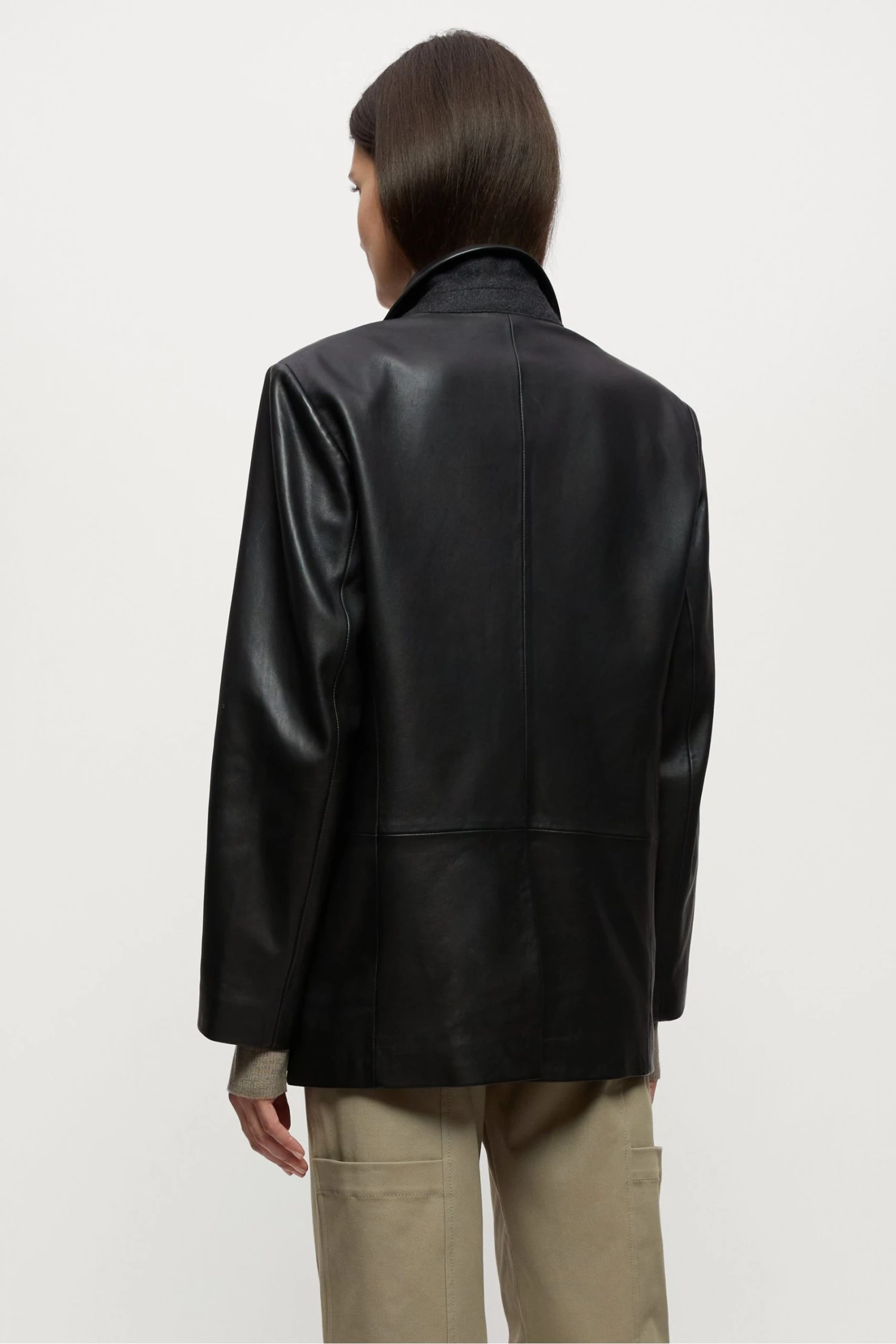 Oversized blazer cut from ethically sourced nappa leather. Featuring a single-breasted front with button closure, back vent, jet flap pockets and notch lapel. Fully lined internal with signature piping detail. A smart casual blazer perfect for light layering. Style with jeans and a T-shirt.