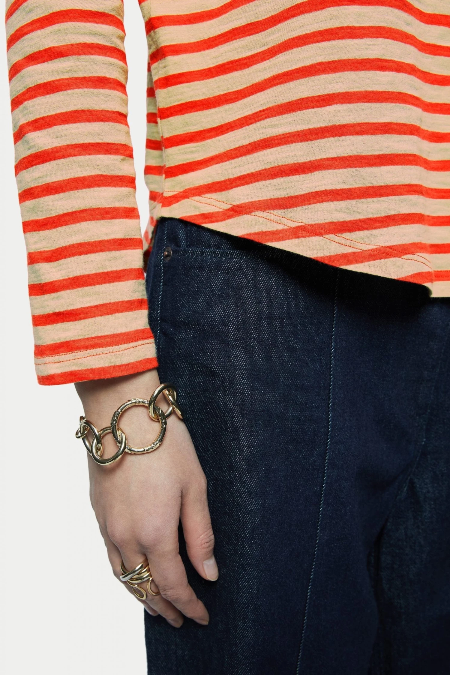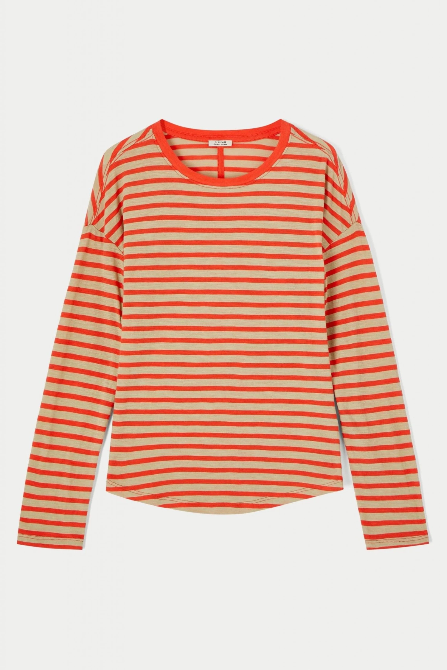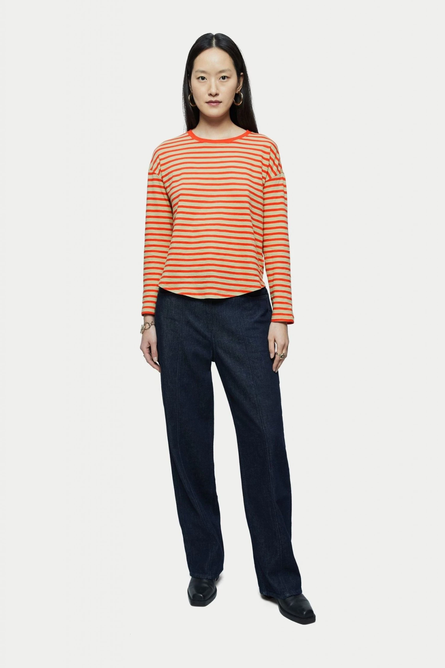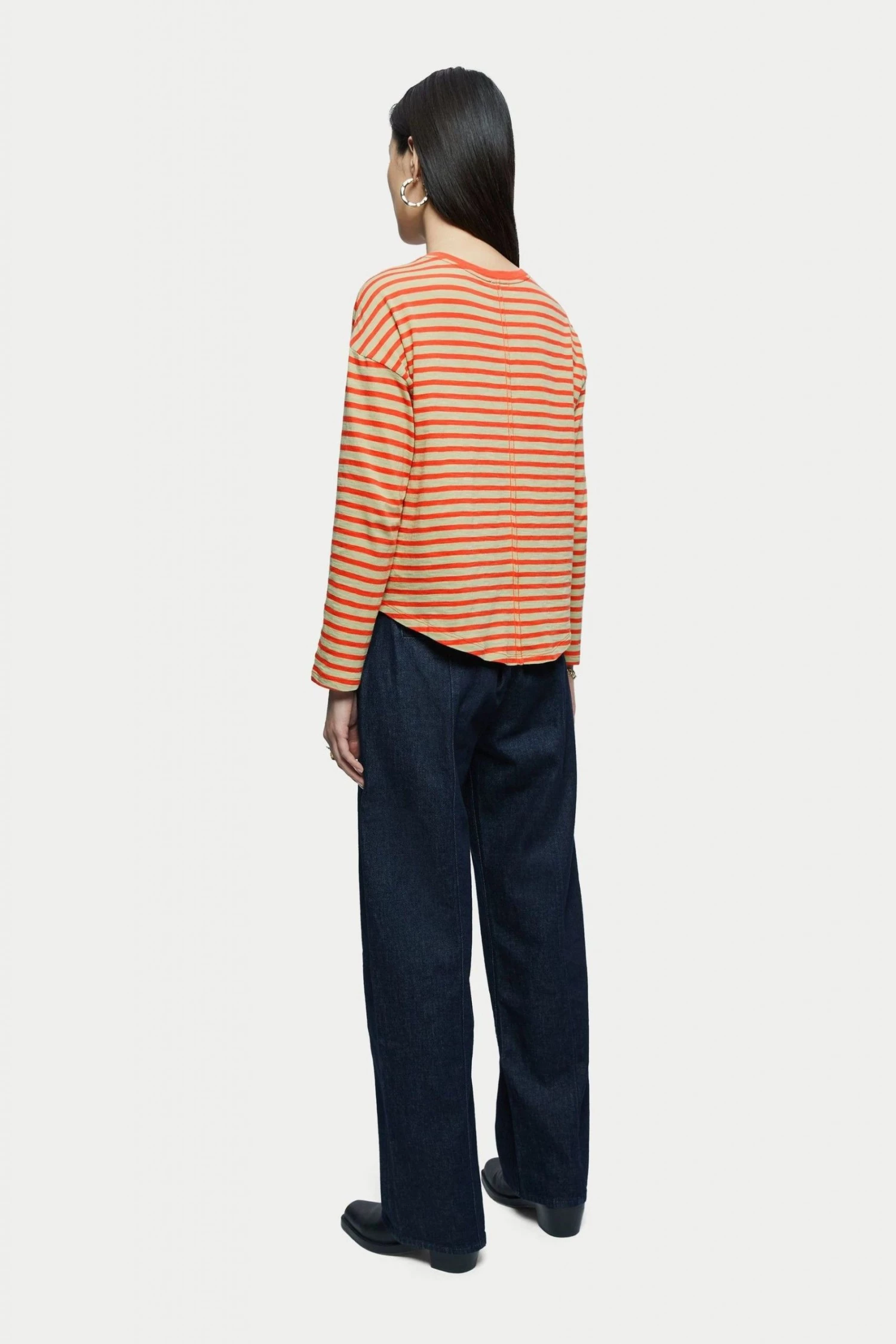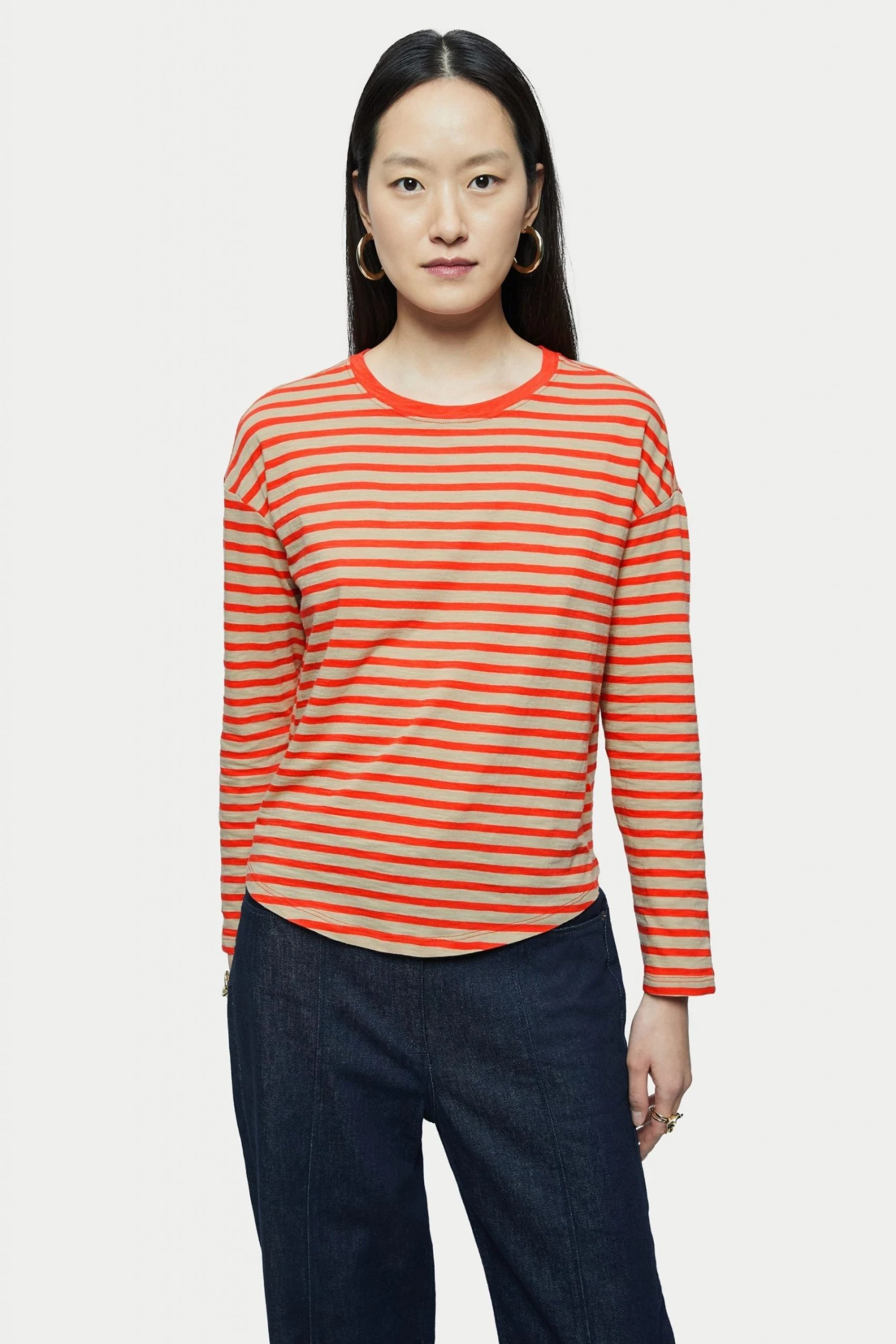 Cotton stripe boyfriend T-shirt with long sleeves. Designed in 100% cotton jersey with a subtle slub. The centre back is detailed with their signature seam and the hem has a scooped shape reminiscent of a man s shirt. Wear with jeans at the weekend or to lend a casual feel under tailoring.