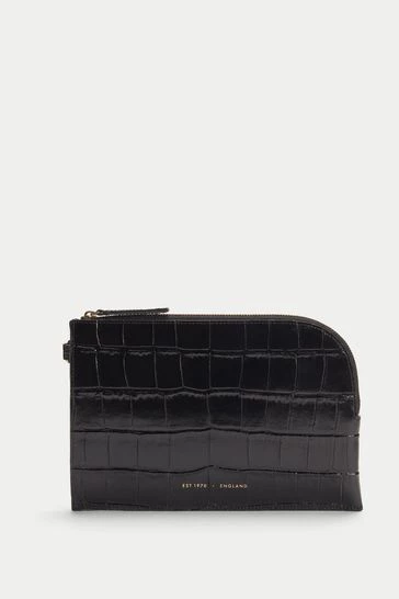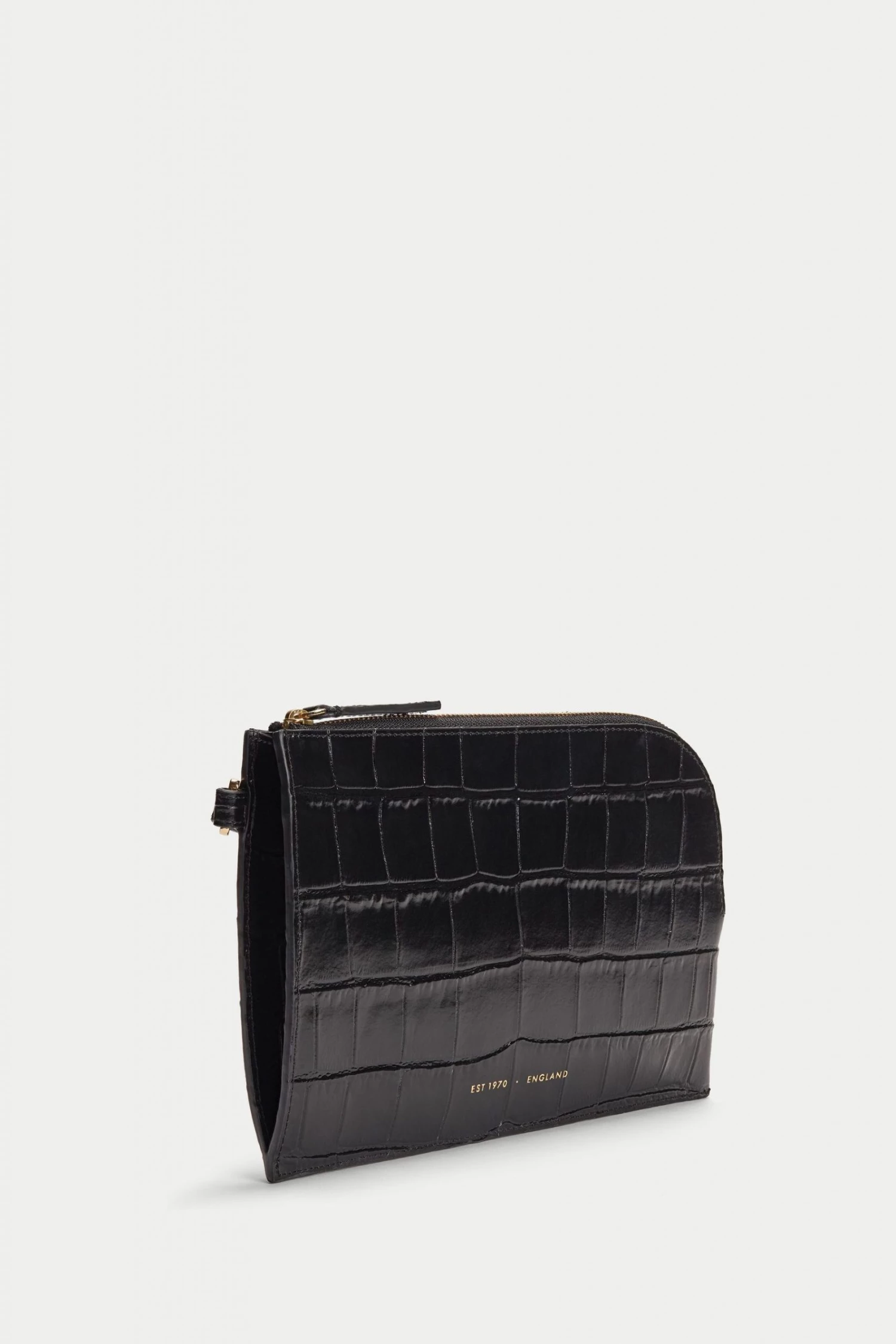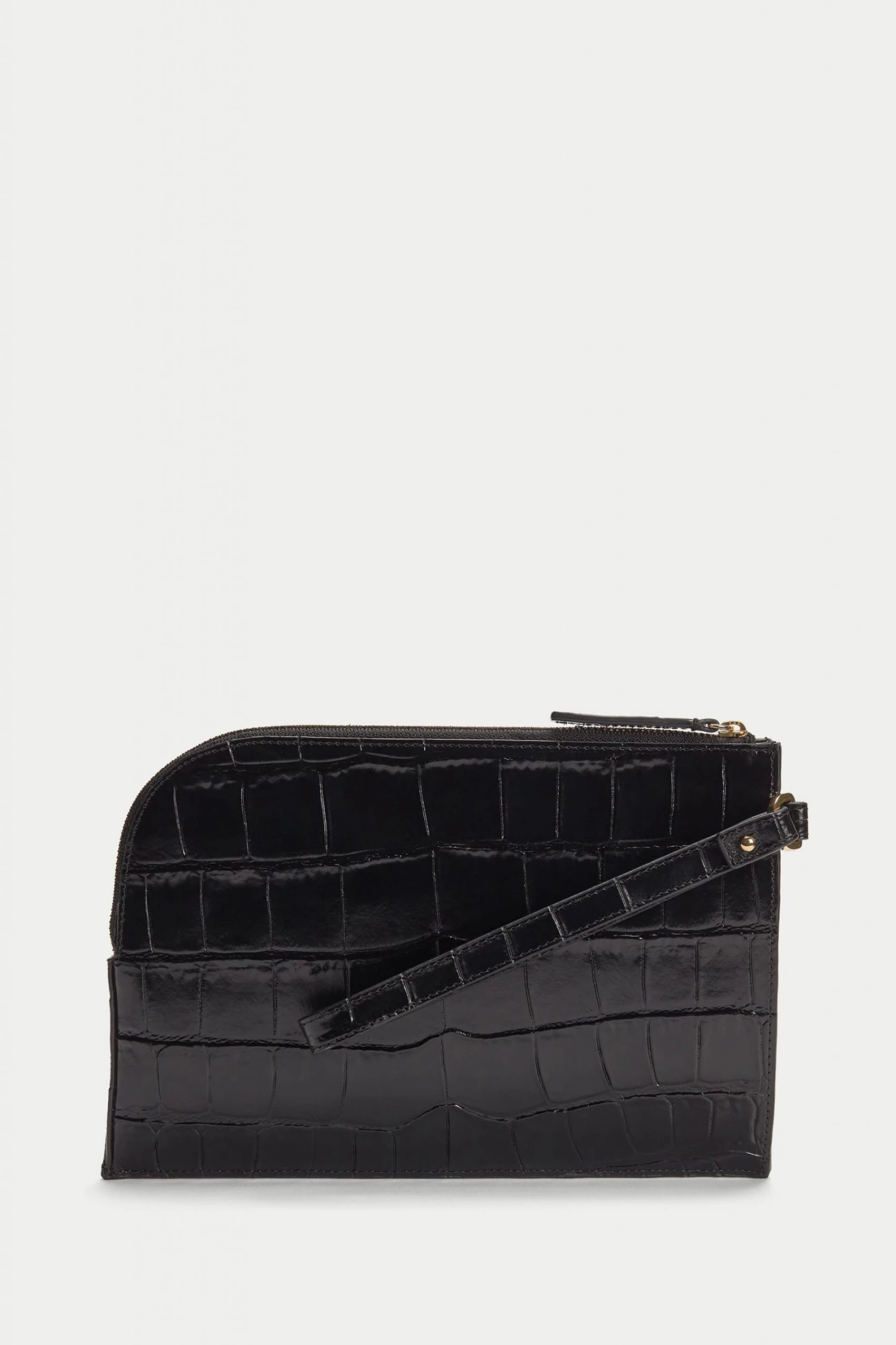 Presented in glossy croc embossed leather, this curved zipped pouch features a detachable wristlet strap. The interior is finished in clean bonded lining in cotton twill fabric.