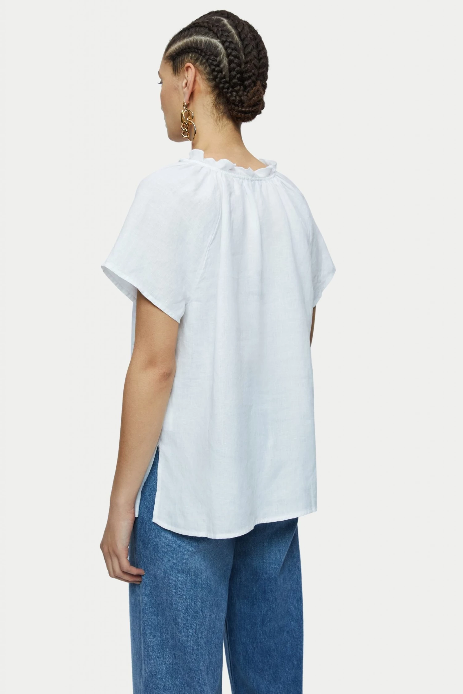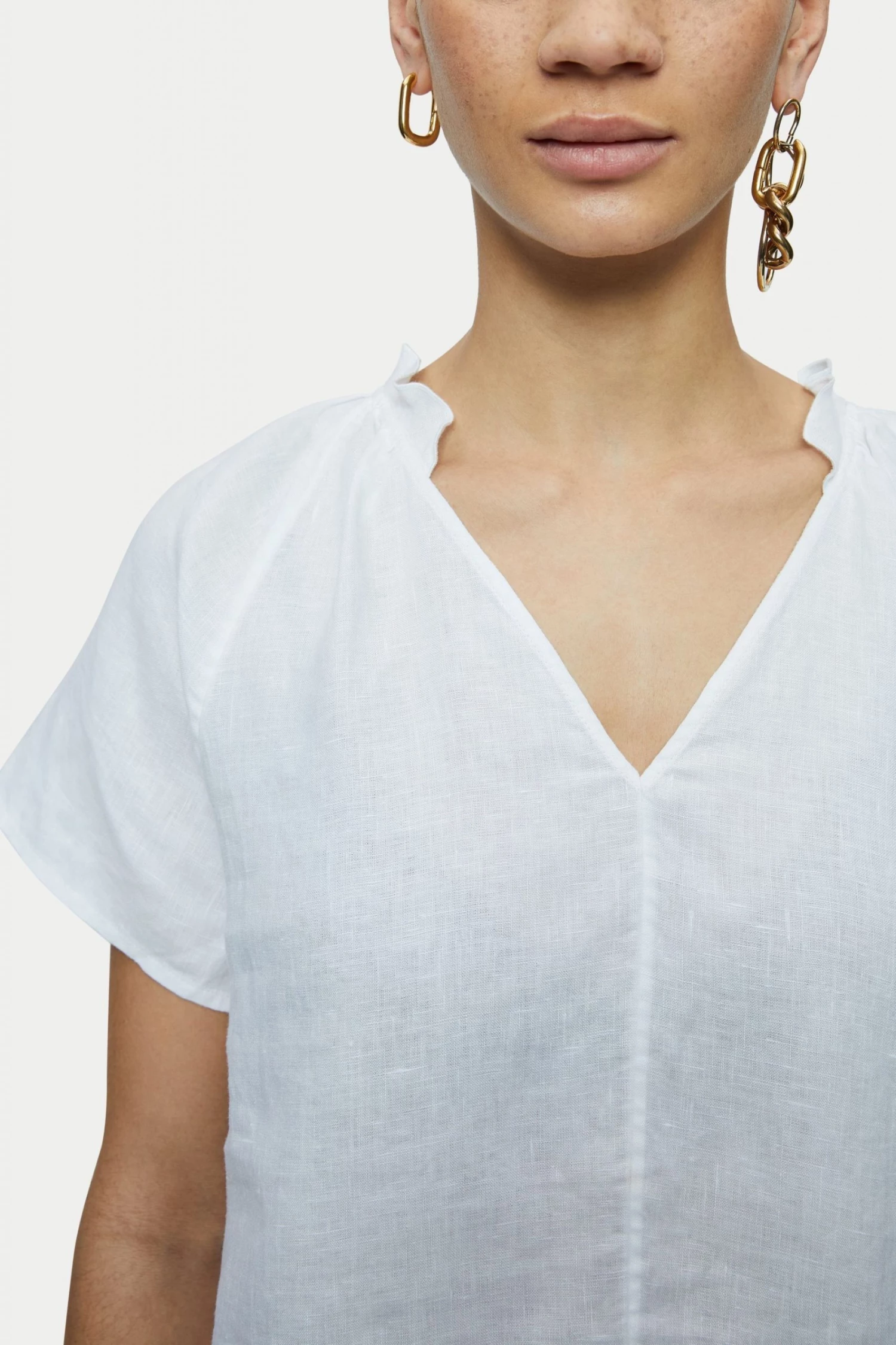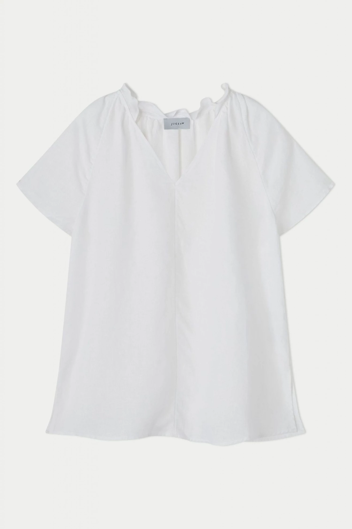 Relaxed lightweight top in 100% linen sourced from Europe. Features a V-neck with ruffle detail and soft raglan short sleeves. Style with denim or chino shorts through summer.