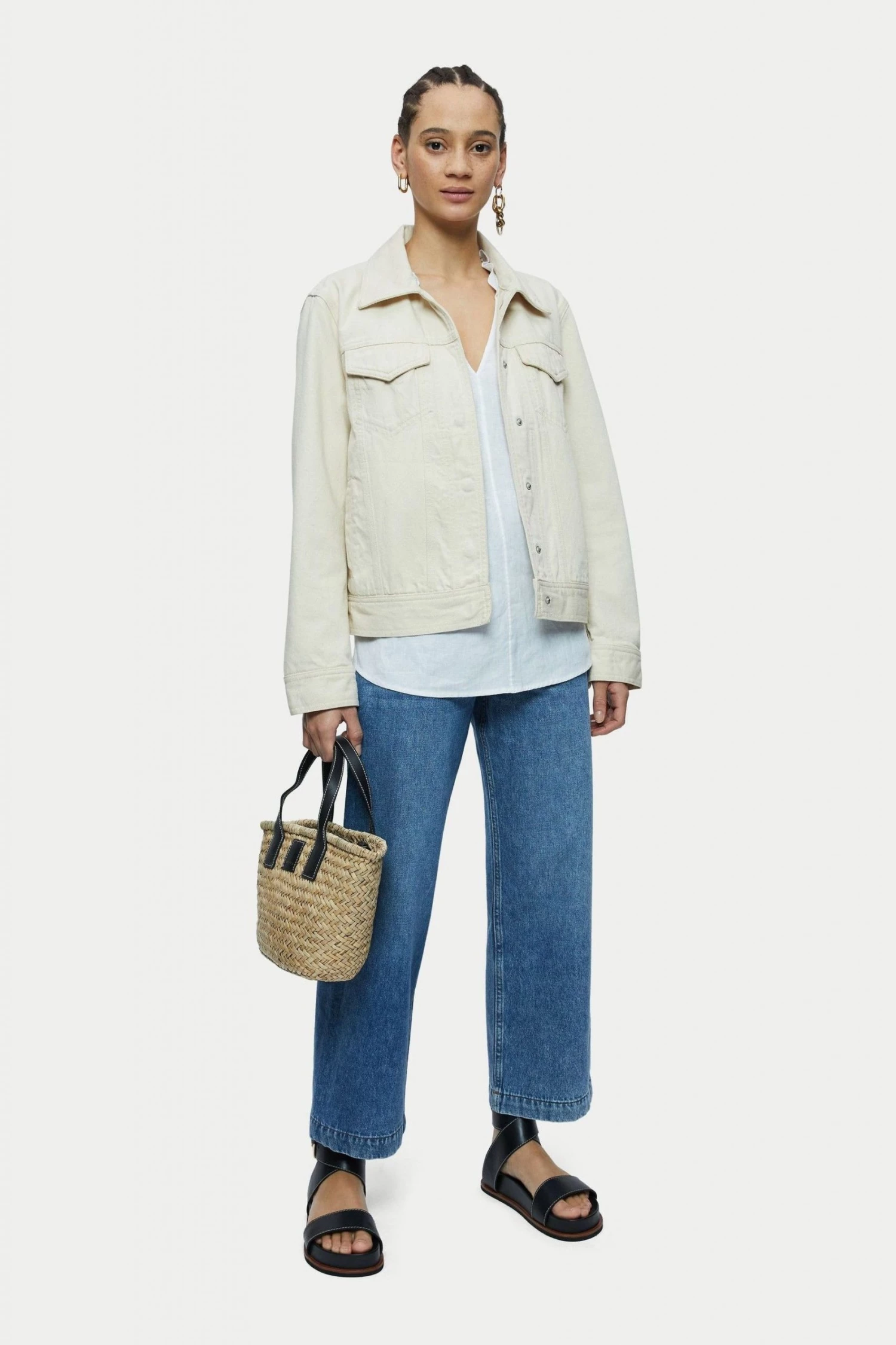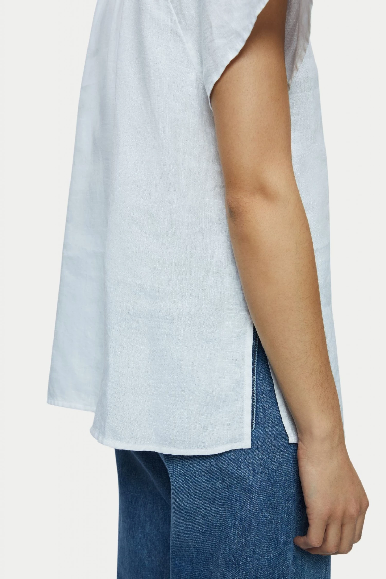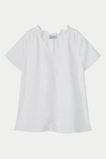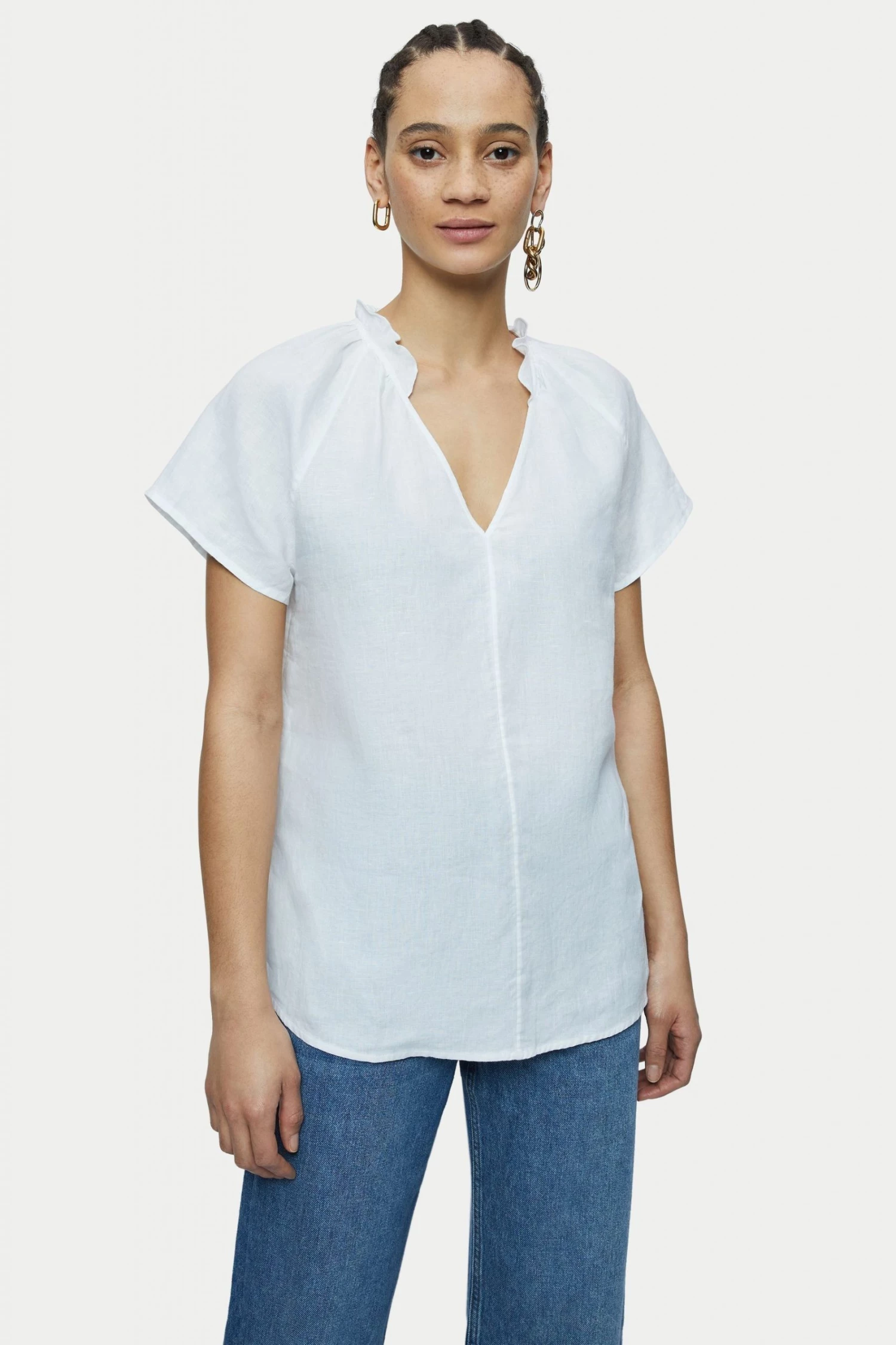 Relaxed lightweight top in 100% linen sourced from Europe. Features a V-neck with ruffle detail and soft raglan short sleeves. Style with denim or chino shorts through summer.