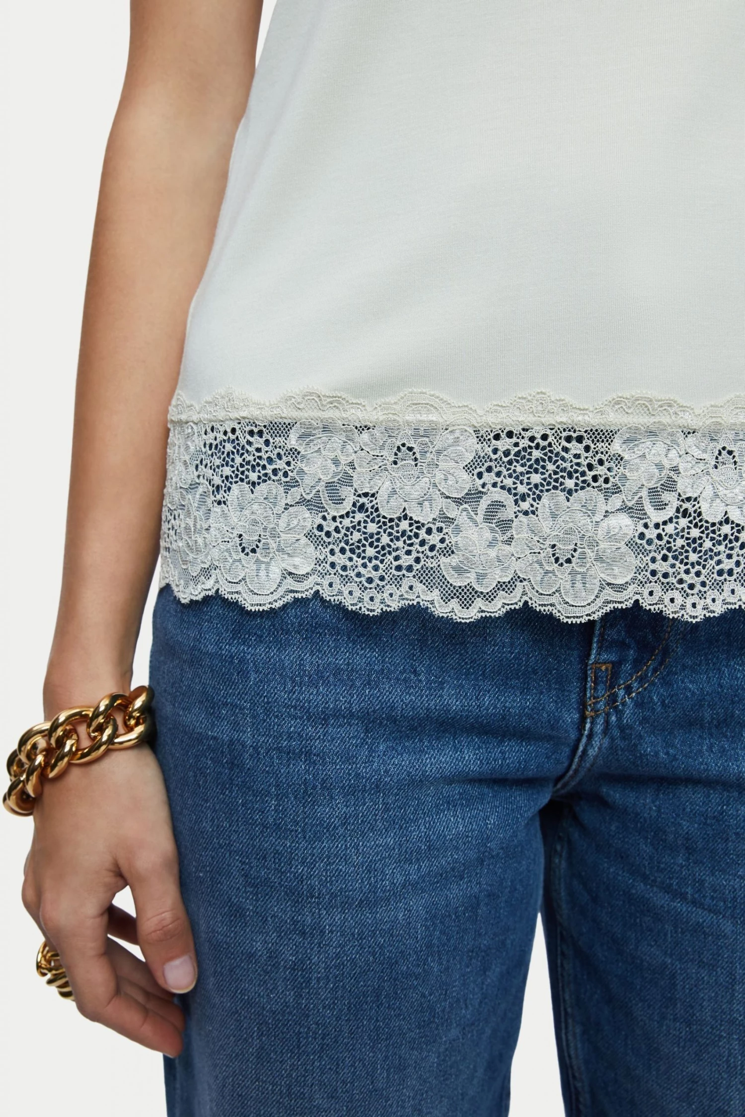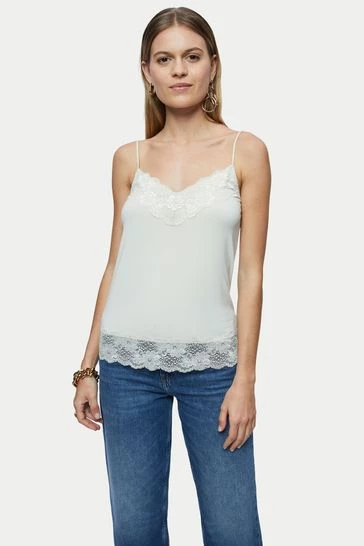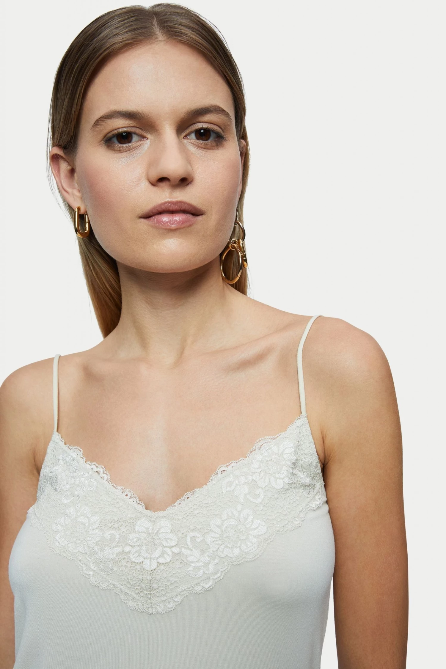 Lace trim vest top. Soft modal jersey. Best-selling style. Slim adjustable straps. Layering piece.